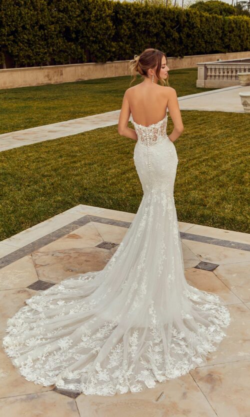 Return To ShopLa morbida sirena presenta ricami floreali 3D smerigliati su tulle scintillante con un corpetto a corsetto trasparente.