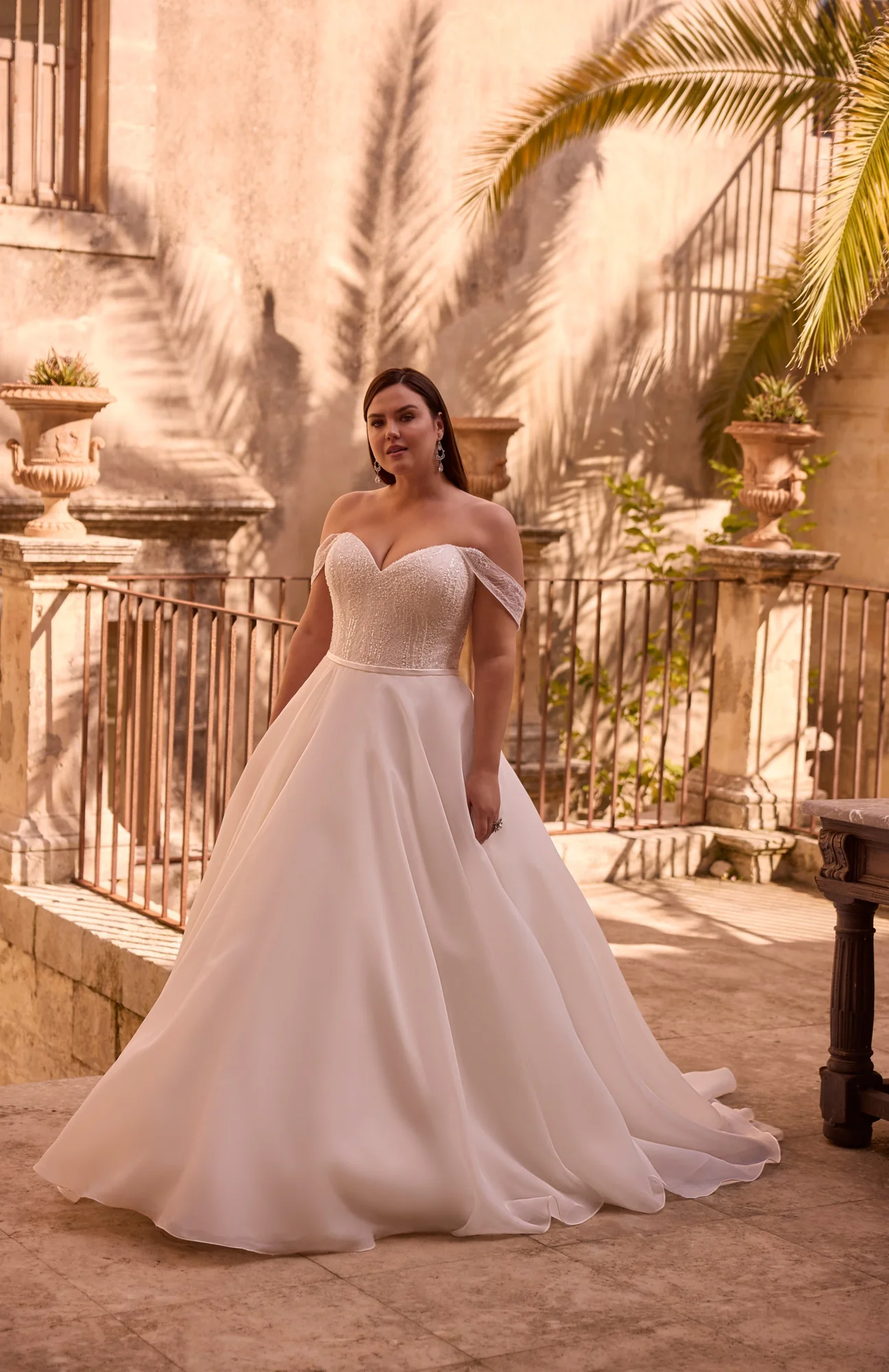 Un abito da sposa da principessa con scollatura a cuore e maniche a cappuccio in pizzo staccabili. Dettagliato con un corpetto di perline e pizzo.