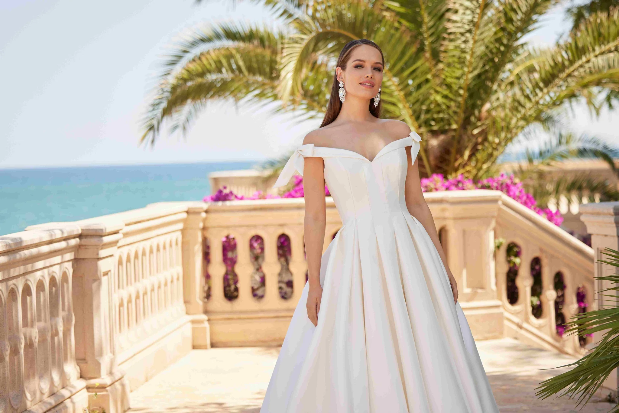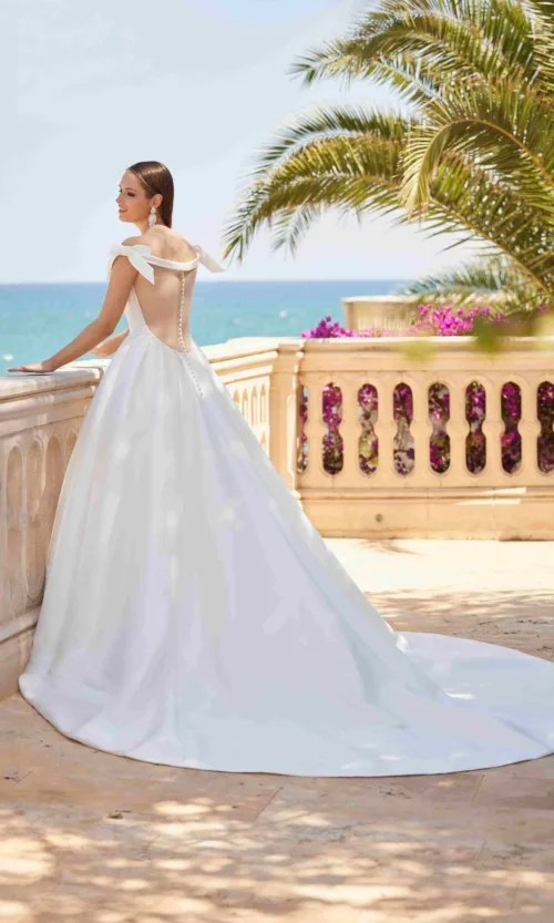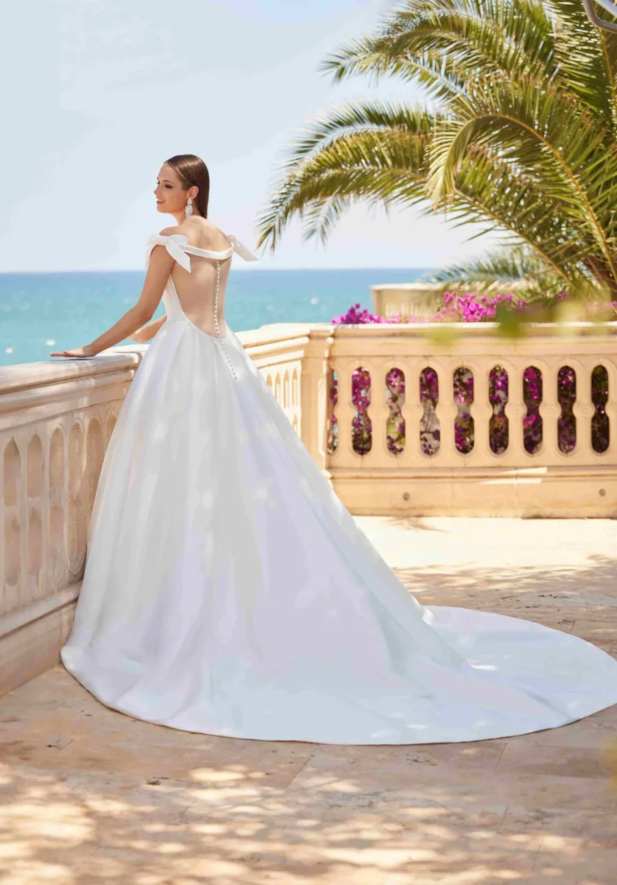 Un romantico abito da sposa da favola con un fiocco scollato sulla spalla. Caratterizzato da una moderna schiena illusione con bottoni da sposa, questo intramontabile abito in raso è perfetto per una sposa tradizionale con un tocco di stile.