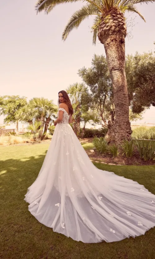 Uno splendido abito da sposa a sirena con spalle scoperte e paillettes, con applicazioni in pizzo floreale. L’abito da sposa stravagante presenta una straordinaria silhouette a clessidra, con uno strascico in pizzo glitterato che fa da urlo.