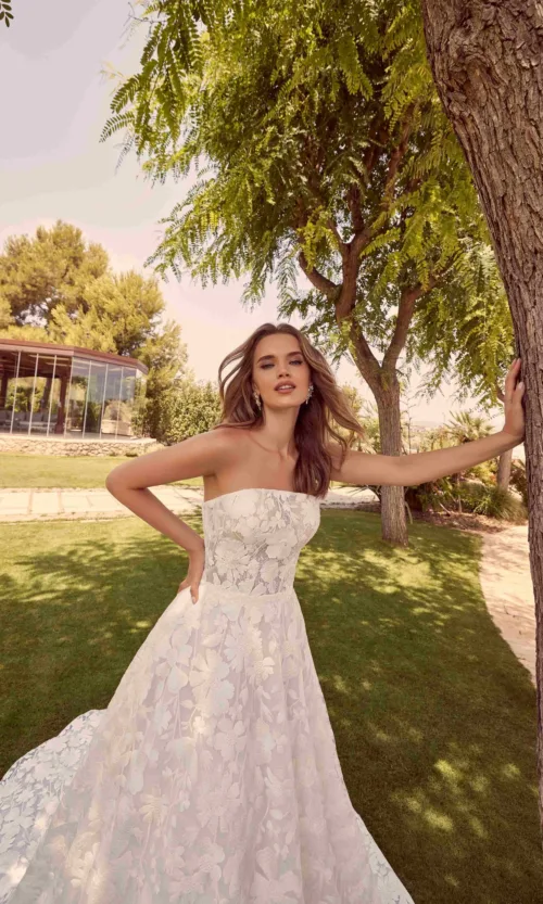 Uno straordinario abito da sposa a palloncino floreale con pizzo meraviglioso che impreziosisce l’intero abito, fino allo strascico mozzafiato. Completo di maniche lunghe staccabili, questo abito è l’ideale per un magico matrimonio primaverile.