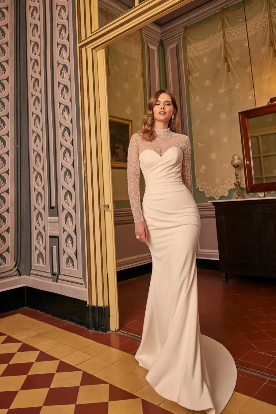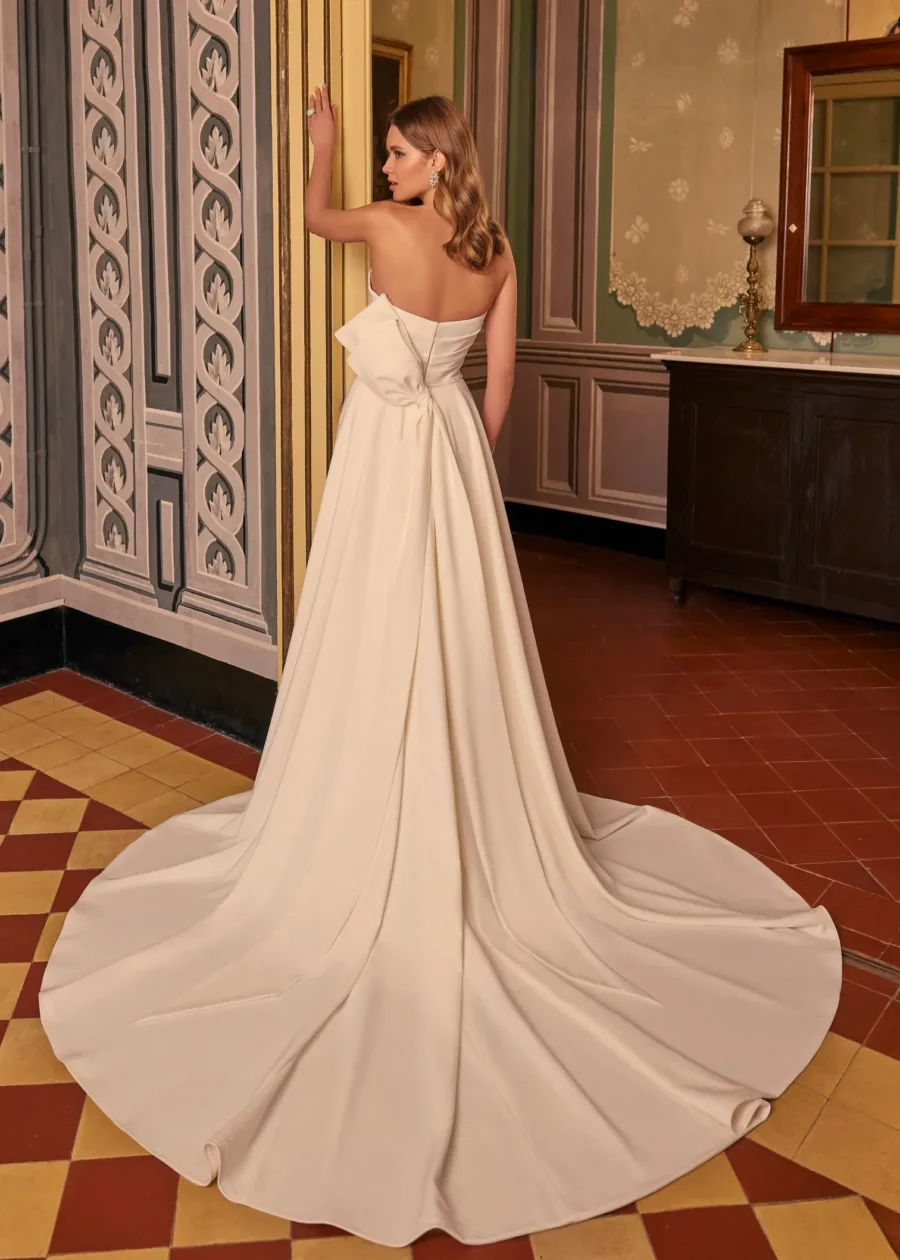 Un abito da sposa aderente e svasato in crêpe, senza spalline, con strascico staccabile e fiocco.