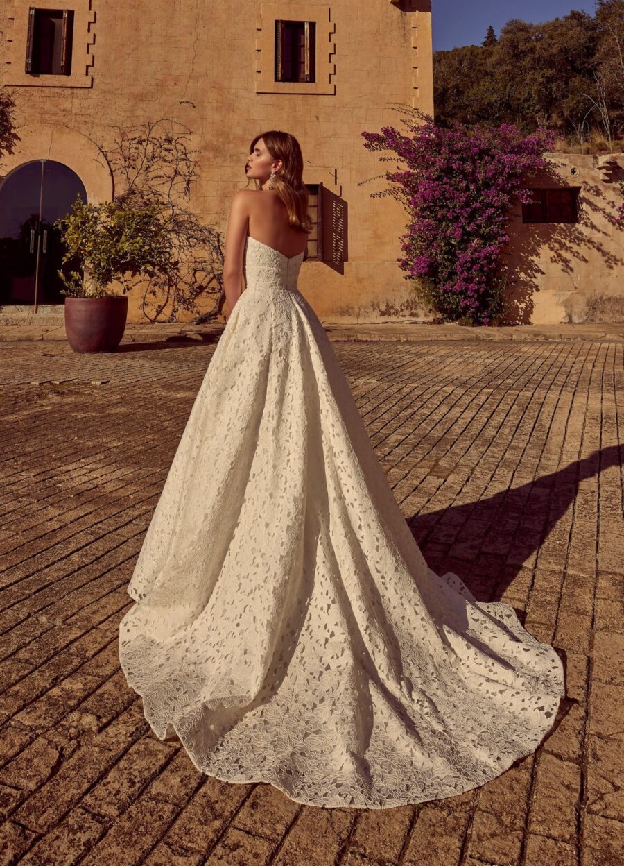 Un abito da sposa da principessa, in pizzo, senza spalline, con scollo a cuore. Completo di velo abbinato con polsino.