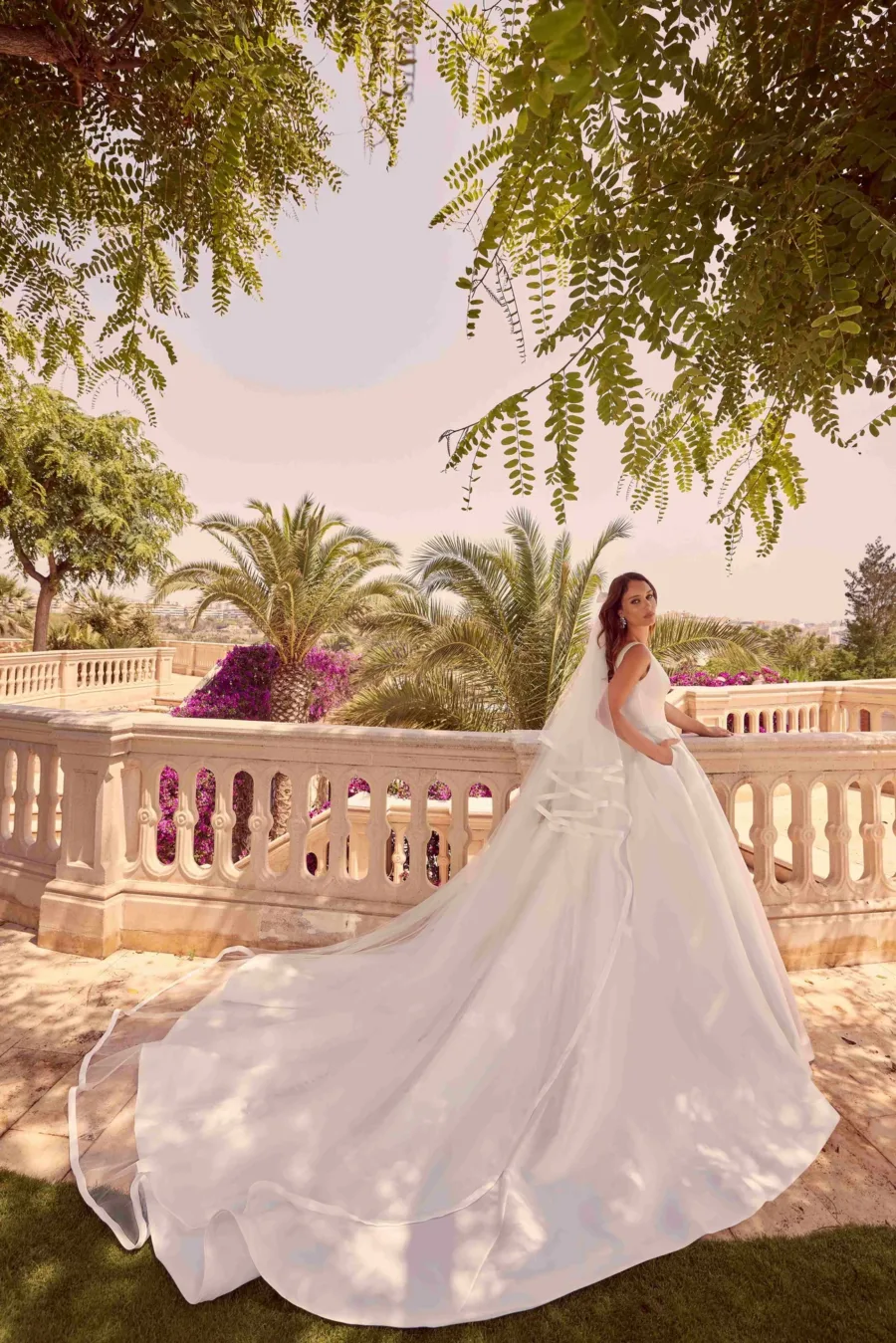 Questo romantico e intramontabile abito da sposa a palloncino presenta una profonda scollatura a illusione e delicati bottoni da sposa lungo lo strascico. Questo abito è chic, elegante e semplicemente sbalorditivo