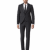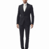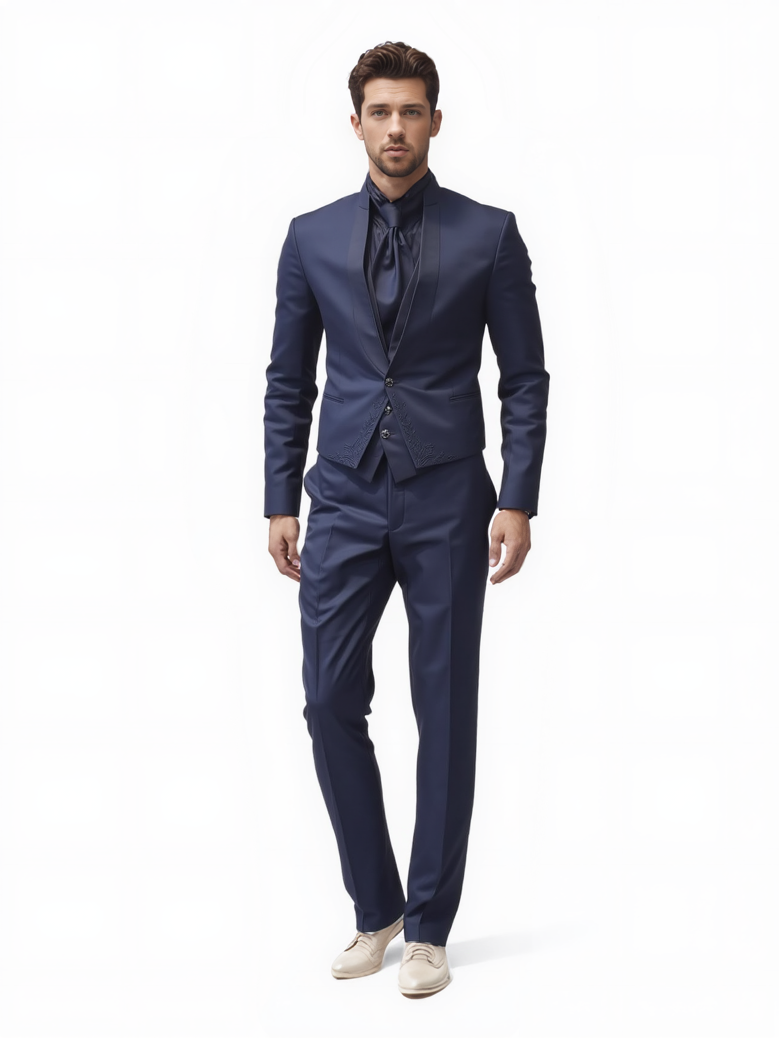 Abito da sposo blu navy in tessuto lucido, composto da giacca monopetto, gilet coordinato e pantaloni slim fit. Completo formale e raffinato.