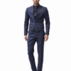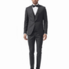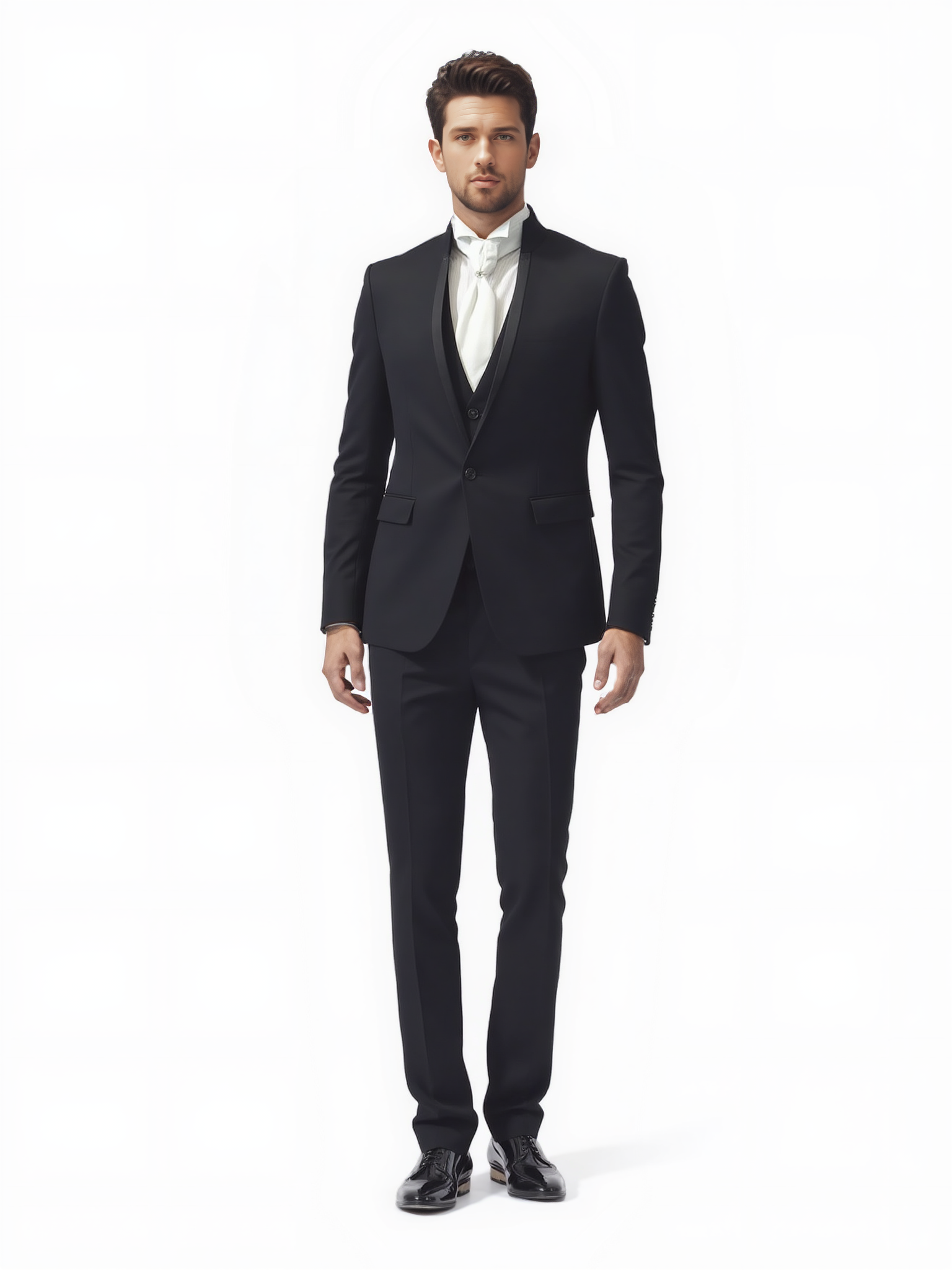 Abito da sposo nero in tessuto pregiato, con giacca monopetto dal taglio sartoriale e pantaloni slim fit. Completo da cerimonia con gilet coordinato e cravatta bianca annodata, ideale per uno stile elegante e formale.