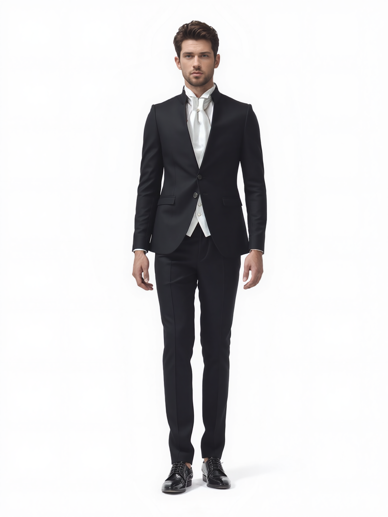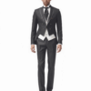 Abito da sposo nero slim fit con giacca monopetto a due bottoni e pantaloni aderenti. Completo da gilet bianco e cravattino coordinato in tessuto lucido, per un look elegante e contemporaneo.
