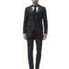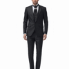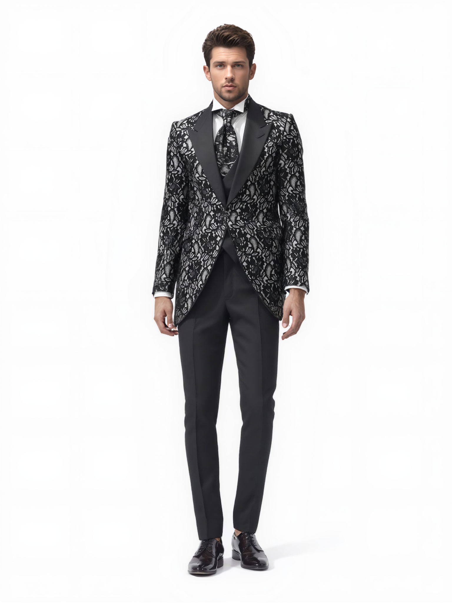 Abito da sposo elegante e distintivo, composto da giacca monopetto con motivo in pizzo nero su base satinata, abbinata a pantaloni neri slim fit. Il completo è arricchito da un gilet nero e una cravatta in tessuto coordinato, per un look sofisticato e originale.
