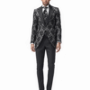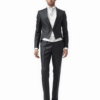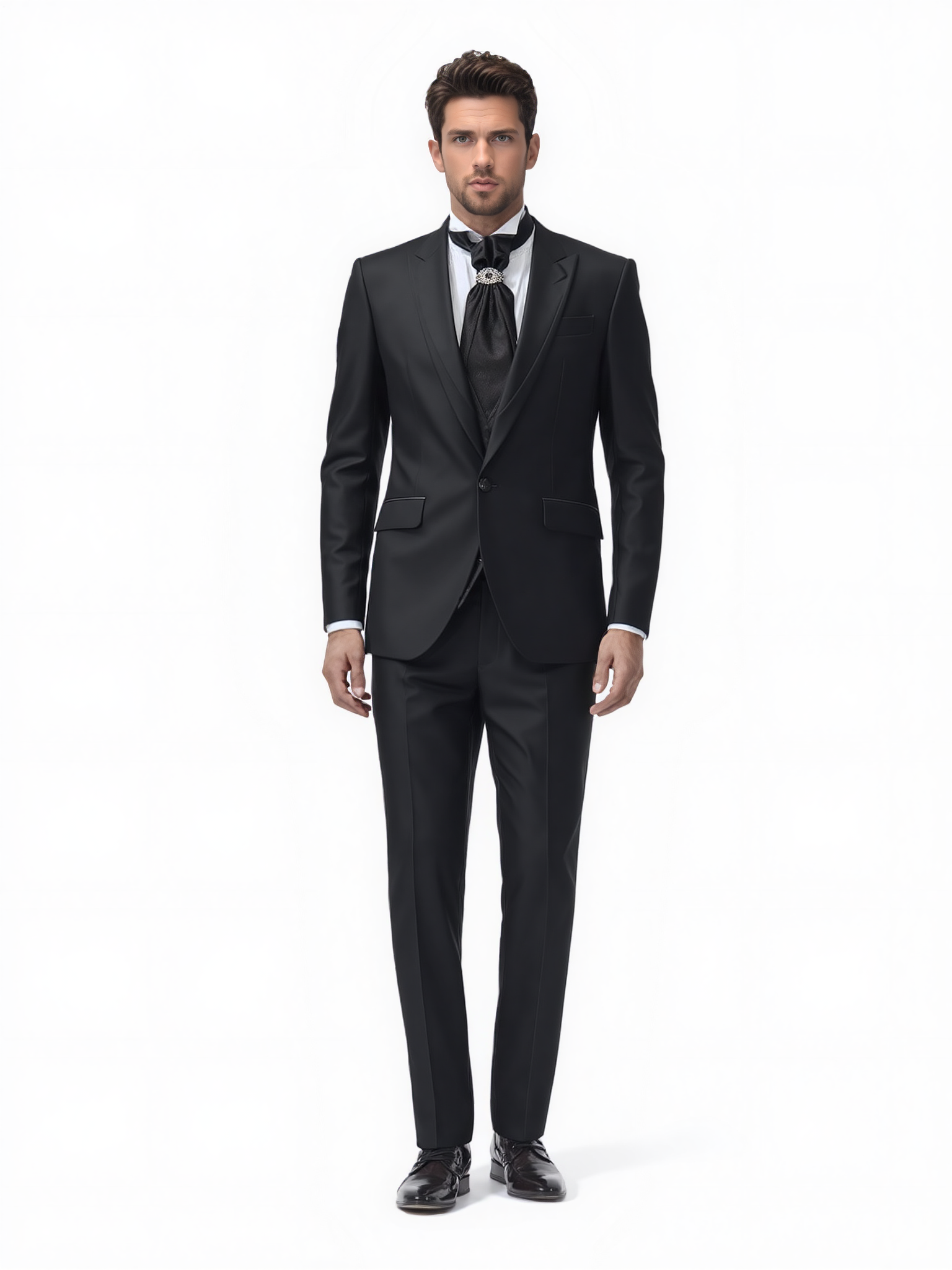 Abito da sposo nero con giacca monopetto a un bottone e revers classici. Completo da gilet coordinato e camicia bianca, impreziosito da plastron nero con spilla decorativa, per un look raffinato e formale.