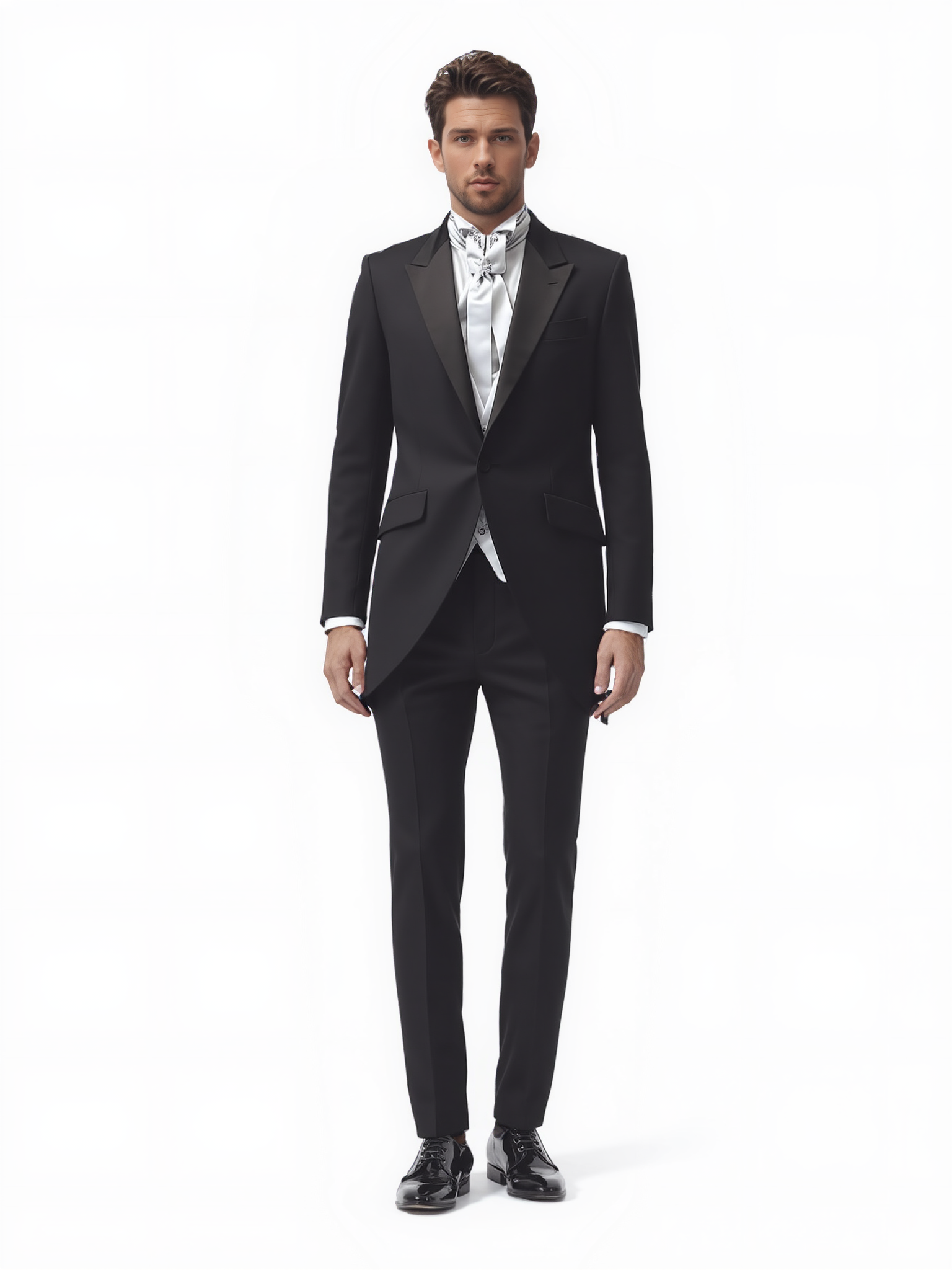 Abito da sposo nero con giacca monopetto a un bottone e code posteriori, impreziosita da revers in raso lucido. Completo da gilet e plastron in raso bianco, per un look elegante e tradizionale con un tocco raffinato.